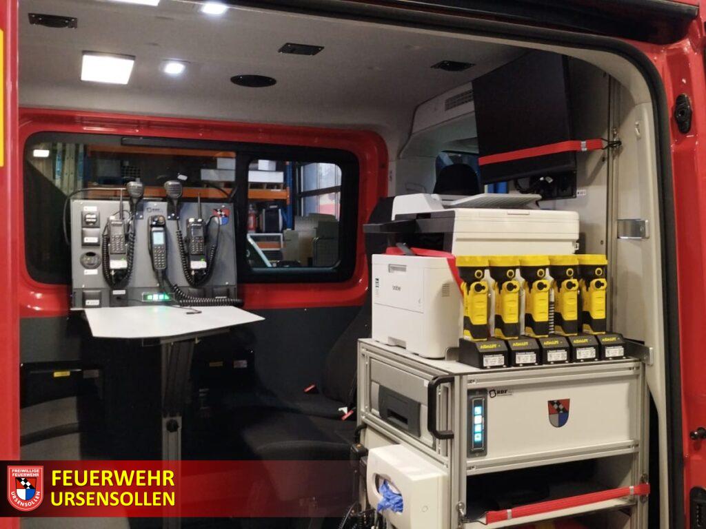 Vor Ort erhielten die Feuerwehrdienstleistenden eine umfassende Einweisung in die vielfältigen Funktionen und die umfangreiche Ausstattung des Fahrzeugs. Zur Beladung gehören unter anderem ein Notebook mit Monitor und Multifunktionsdrucker, der insbesondere bei größeren Schadenslagen oder bei Einsätzen der Abschnittsführungsstelle die Einsatzdokumentation und -führung erleichtert. Darüber hinaus verfügt das Fahrzeug über eine Markise, ein Schnelleinsatzzelt sowie das Einsatznavigationssystem Lardis. Für medizinische Erstmaßnahmen stehen ein Rettungsrucksack und ein Defibrillator zur Verfügung. Ergänzt wird die Ausstattung durch weiteres Material zur Einsatzdokumentation und Führungsunterstützung sowie durch Material zum Einrichten einer Atemschutzsammelstelle. Auch Material zur Verkehrsabsicherung, Einsatzstellenausleuchtung und Stromversorgung ist vorhanden.